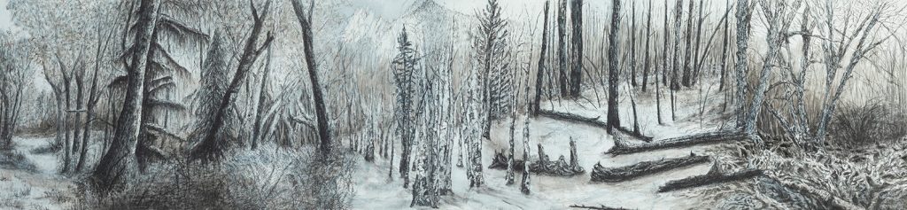 Research shows that trees have a network that allows them to communicate with other trees. These scenes are from across the country; what if they could share their wisdom with trees from another region? In this landscape drawing we can imagine the trees are chatting away, sharing insights and survival stories.